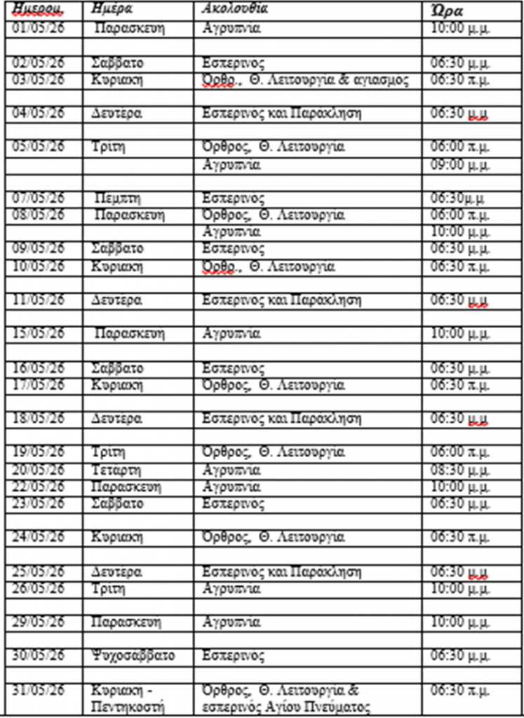 Πρόγραμμα Ακολουθιών Μαϊου 2026
