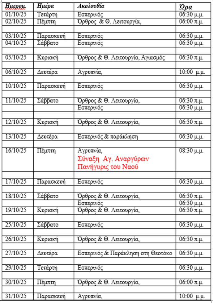 Πρόγραμμα ακολουθιών Οκτωβρίου 2025